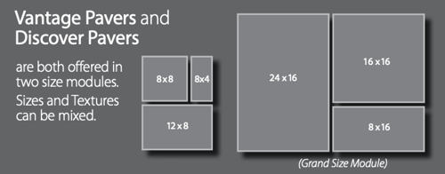 County Materials dimensionally compatible paver series are produced in four-inch increments. Our pavers are crafted with U.S. measurements and are designed to work in combinations or as individual units. As a result, an endless number of patterns can be created using dimensionally compatible pavers, including our original series of Elements Paving Stones, and our newest lines of Discover, Grand Discover, Vantage and Grand Vantage pavers in a variety of sizes, colors and textures.