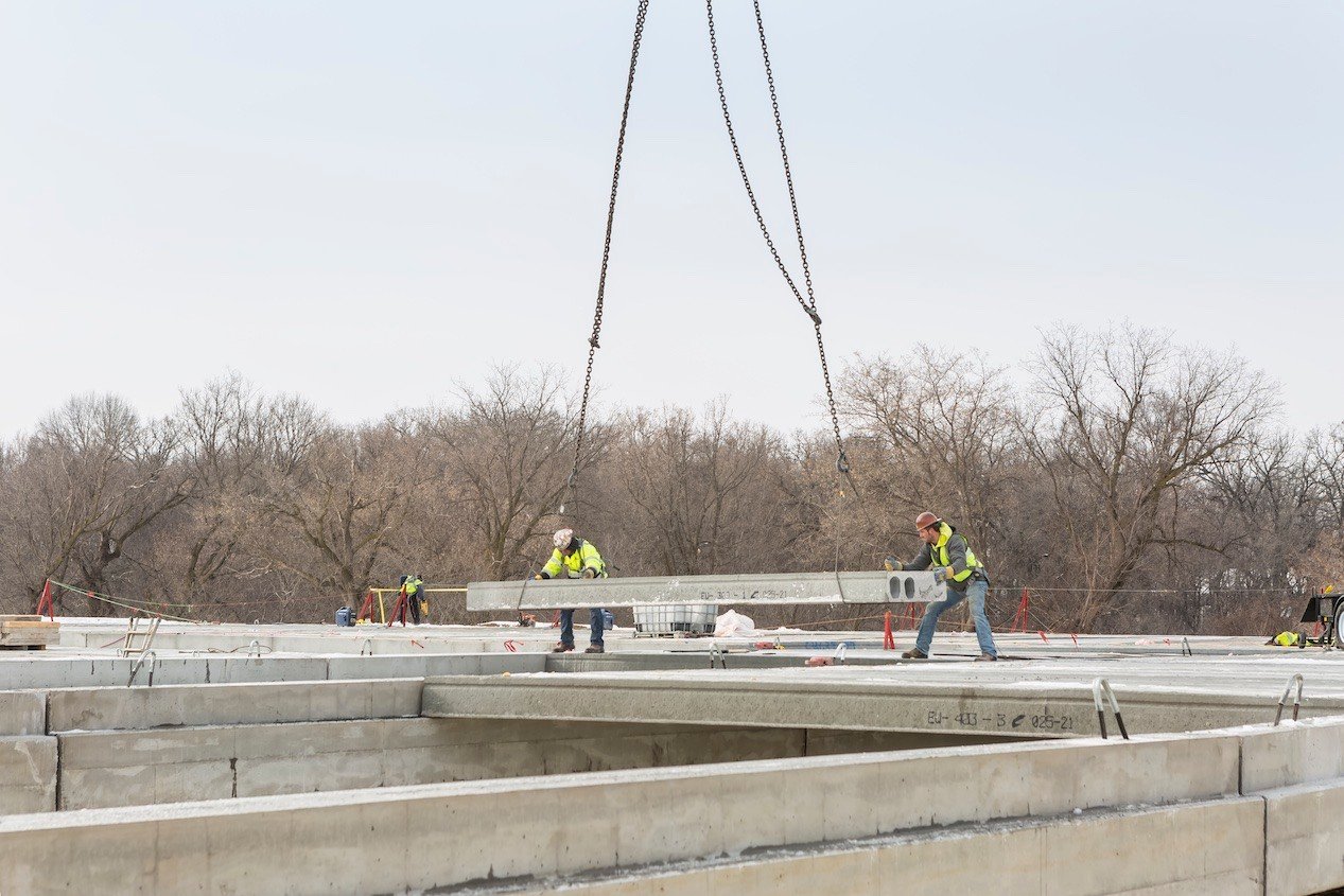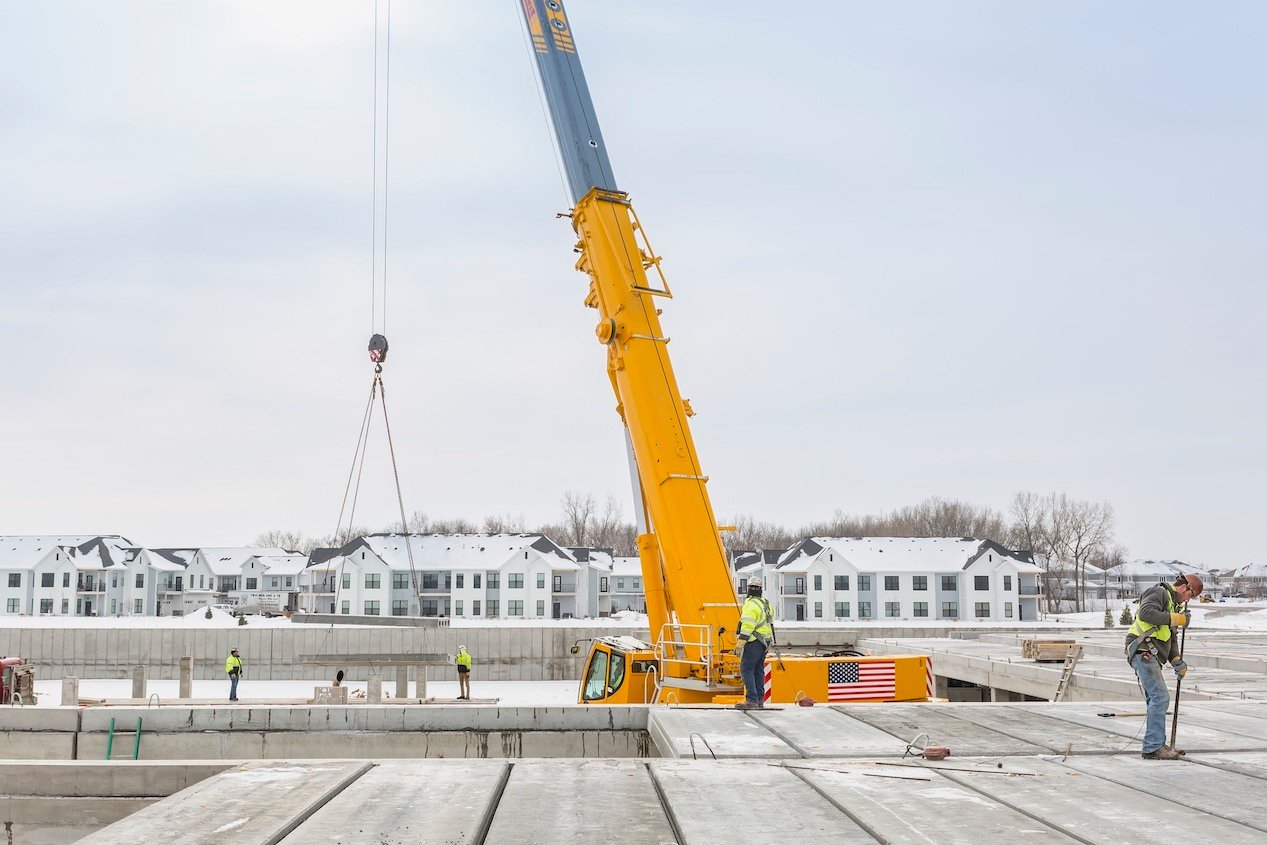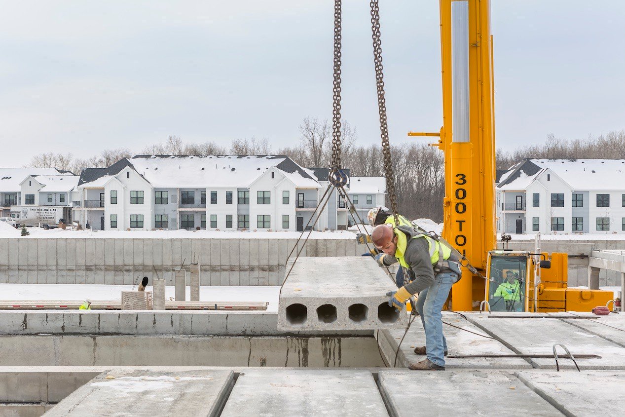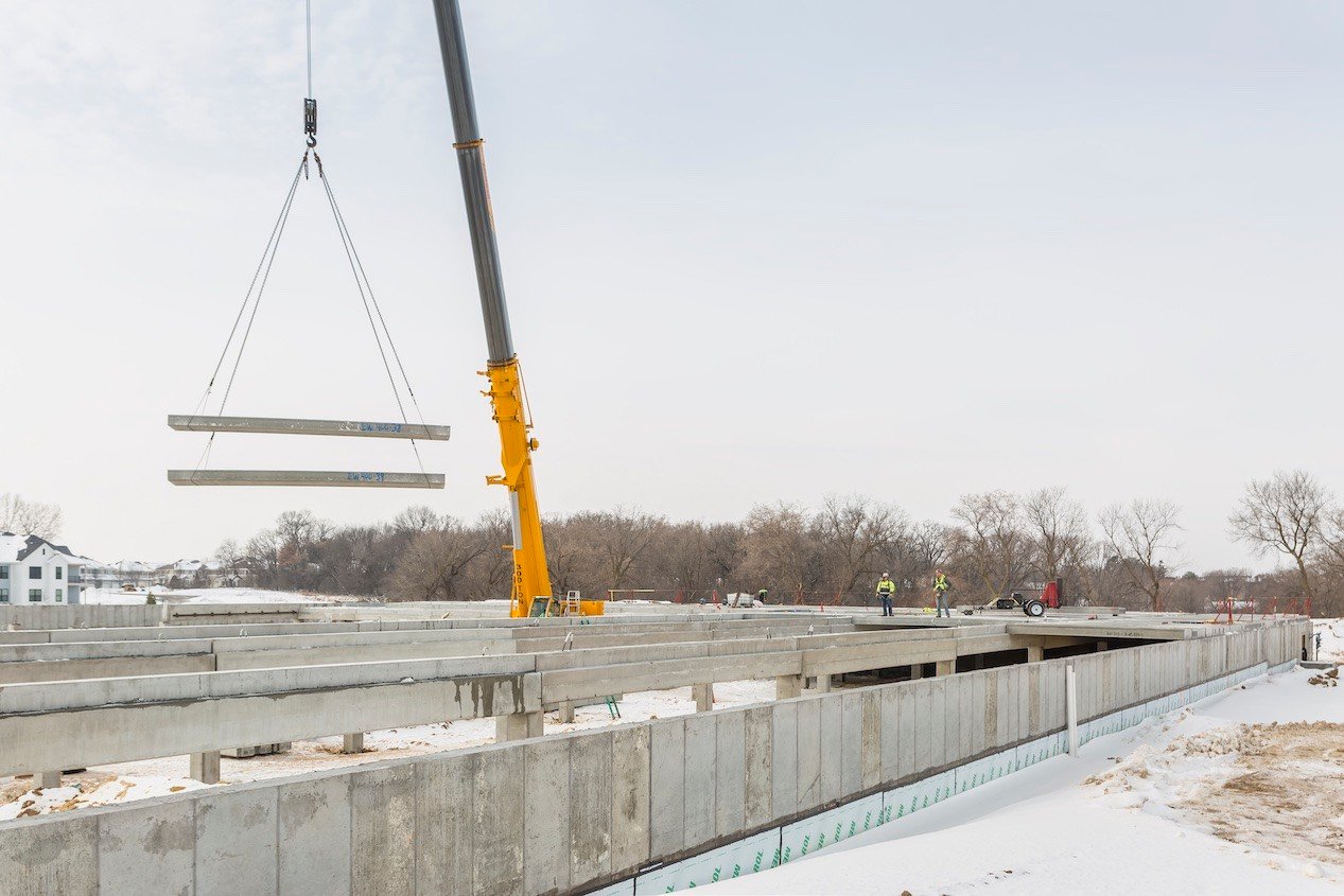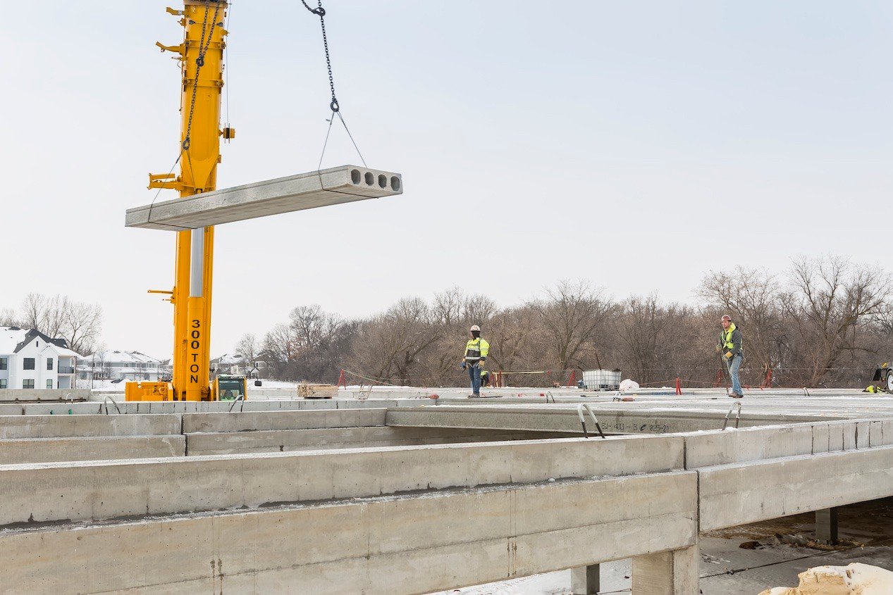 Faced with an aggressive construction schedule, project managers for the 207-unit Edison Apartments at Woodbury, a high-density housing project in the Minneapolis–Saint Paul metropolitan area, selected our Hollowcore as the project’s podium solution for underground parking. With just 8 days allotted for production and 28 days for installation, we delivered 86,000 SF of 12-inch depth hollowcore planks and 1,200 SF of 12-inch depth solid slabs to the job site with time to spare.